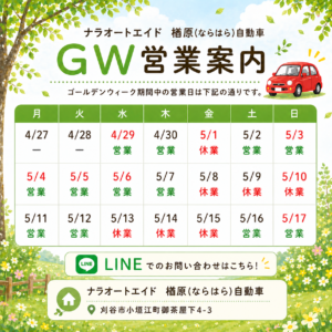お知らせ 🚗🌼GW期間の営業日のご案内🌼🚗 2026.04.29 お知らせ 日頃より、ナラオートエイドをご愛顧いただき、誠にありがとうございます❗️😊 令和8年度、GW期間の営業日についてお知らせ致します。 よろしくお願いいたします✨🚗🛠️ 前の記事へ 一覧に戻る